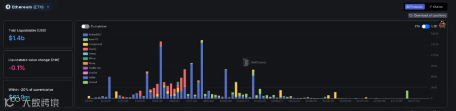 ii. 去中心化交易所方面,ETH在2347开始有大额清算,在883至378为密集清算区,530为最大清算点。