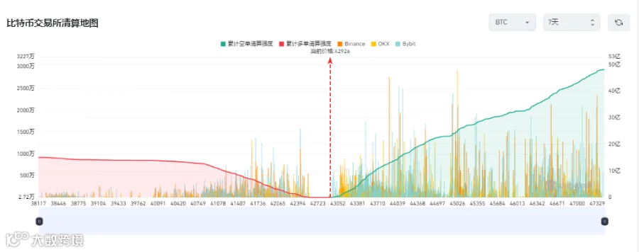i. 从本周中心化交易所合约交易BTC清算地图来看,BTC本周多单累计清算强度远远小于于空单累计清算强度,空单累计清算强度48.04亿美元,多单方面累计清算强度15.12亿美元,多单在当前价位42926至42563为真空区,在42563至40749为密集清算区,空单在当前价位42926至47329为密集清算区。