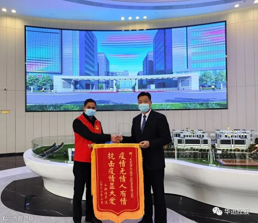 近日,斗朗社区党委书记霍赞荣等社区干部一行人来到华迅,专程送来写有“疫情无情人有情,抗击疫情显大爱”的红色锦旗,并致感谢,以此感谢华迅人在抗疫中的贡献。