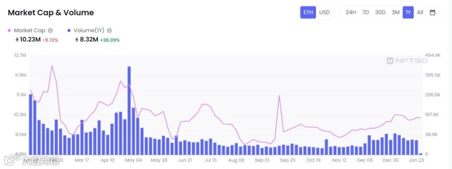 根据相关数据,NFT 总市值在 2022 年年初第一季度达到峰值。峰值时间点后随市场发展,整体市值呈现下降趋势。