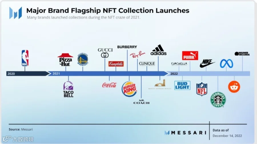 根据2023年1月20日数据,单在以太坊网络上累计发行的 NFT 资产数量已突破1.2亿枚大关,共计13.6万个NFT项目被部署到以太坊网络,不少传统大厂和品牌陆续在NFT崭露头角。其中将NFT作为品牌IP的新叙事手段,来进行品牌宣传和商业活动是一大趋势,如国内有腾讯、百度、B站、阿里巴巴等;国外有可口可乐、星巴克、保时捷等。