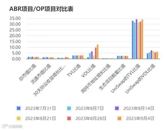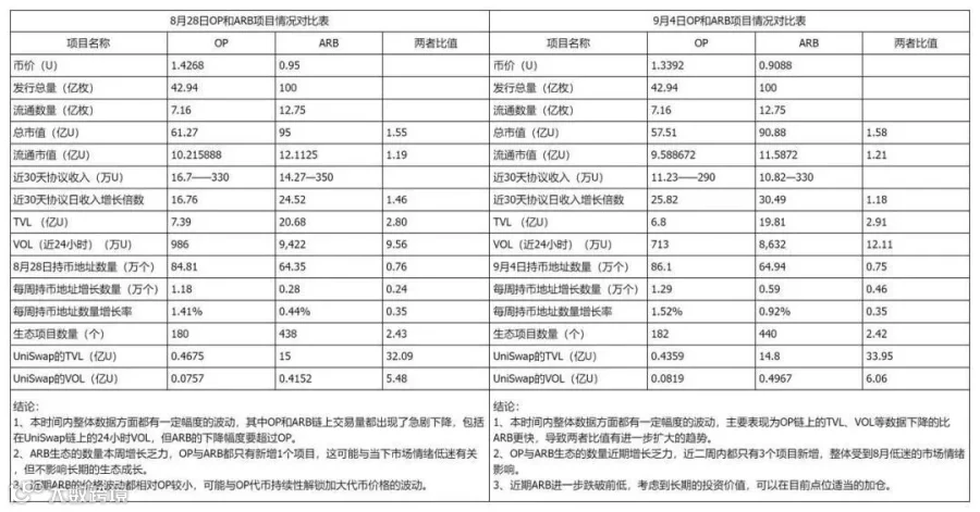 1. 本时间内整体数据方面都有一定幅度波动,主要表现为OP链上的TVL、VOL等数据下降得比ARB更快,导致两者比值有进一步扩大的趋势。