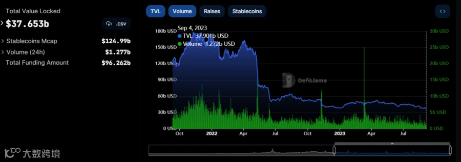 g. 从全链的TVL数据上来看,目前整体偏弱,TVL从牛市最高的1700亿左右下降到目前的370亿左右,依旧还有下跌趋势,链上交易量也下降明显。