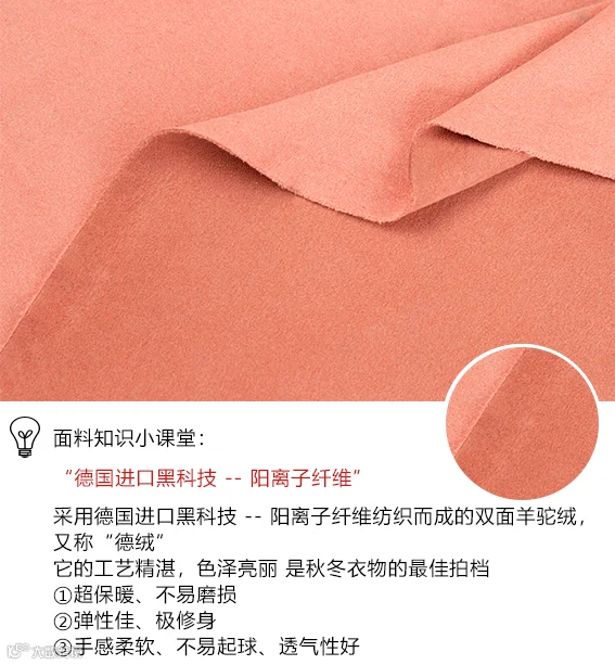 双面羊驼绒做出来的衣物轻盈,在秋季外单穿一件粉粉的双面羊驼绒外套,秒变软萌少女,既舒适又保暖,因为其纤维的细长,贴身穿着时不会有刺痛感。