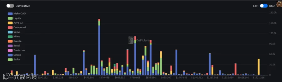 ii. 去中心化交易所方面,ETH在1521,1378,1220,1045分别均有30000+以上的ETH清算,其中以1045至443为密集清算区,531为最大清算点。