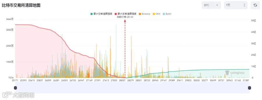 i. 从本周中心化交易所合约交易BTC清算地图看,BTC本周多空方面呈现较大差异,与上周趋势相反。本周空单相对松散且清算强度较低,多单清算密集,其中清算强度最高点为27894,有累计1.37亿美元。在28096至26262有累计38.42亿美元的清算强度,而空单在28251至30211只有累计7.03亿美元清算强度。