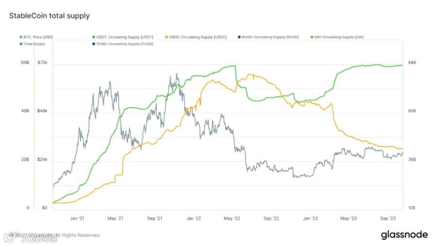USDT微弱增加0.6亿美金,USDC/TUSD/BUSD均呈现下降状态。