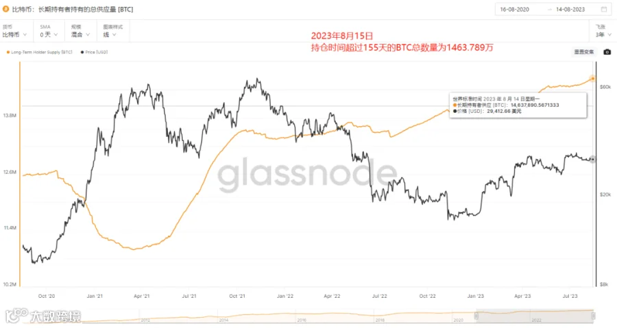d. 目前市场一方面是换手率低下,流动性极差,新投资者对于买入的期望值越来越低,另一方面购买时间稍微长一点的投资者很多都开启了躺平模式,从当前持仓超过155天没有移动过的BTC数据来看,仍然是处于极速攀升的趋势,当前已经有超过1,463.4万枚的BTC在最少155天的时间中没有发生过移动,占了流通总量的75.21%,同样,这个数据也达到了历史最高值。这所代表的含义就是经过长期的洗盘,更早之前不论是获利筹码还是亏损筹码该跑的都跑的差不多了,剩下的几乎都是在以长期持有为目标,除非发生很大的新叙事,否则这部分筹码大可能不会离场。