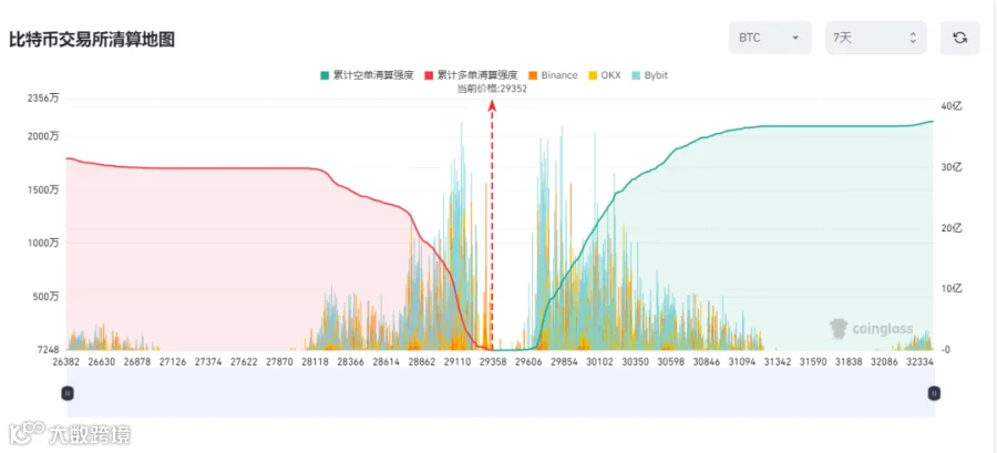 e. 从本周中心化交易所合约交易BTC清算地图来看,情况几乎和上周类似,在市场价格没能跑出当前区间之前,目前价格上下都有比较多的订单累计,虽然近几周市场交易量萎缩比较厉害,但是合约订单量还在累计,在当前价格上线1000美金的区间内依旧累计了超过40亿美金的合约订单。另外去中心化方面,由于价格维持震荡,链上交易量维持低位,所以链上清算没有太大变化。