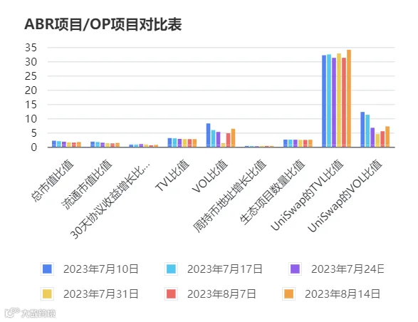 1. 本时间内整体数据方面都较上周变动较大,例如流通市值、TVL、24小时交易量VOL等,ARB对比OP的领先优势有所扩大。