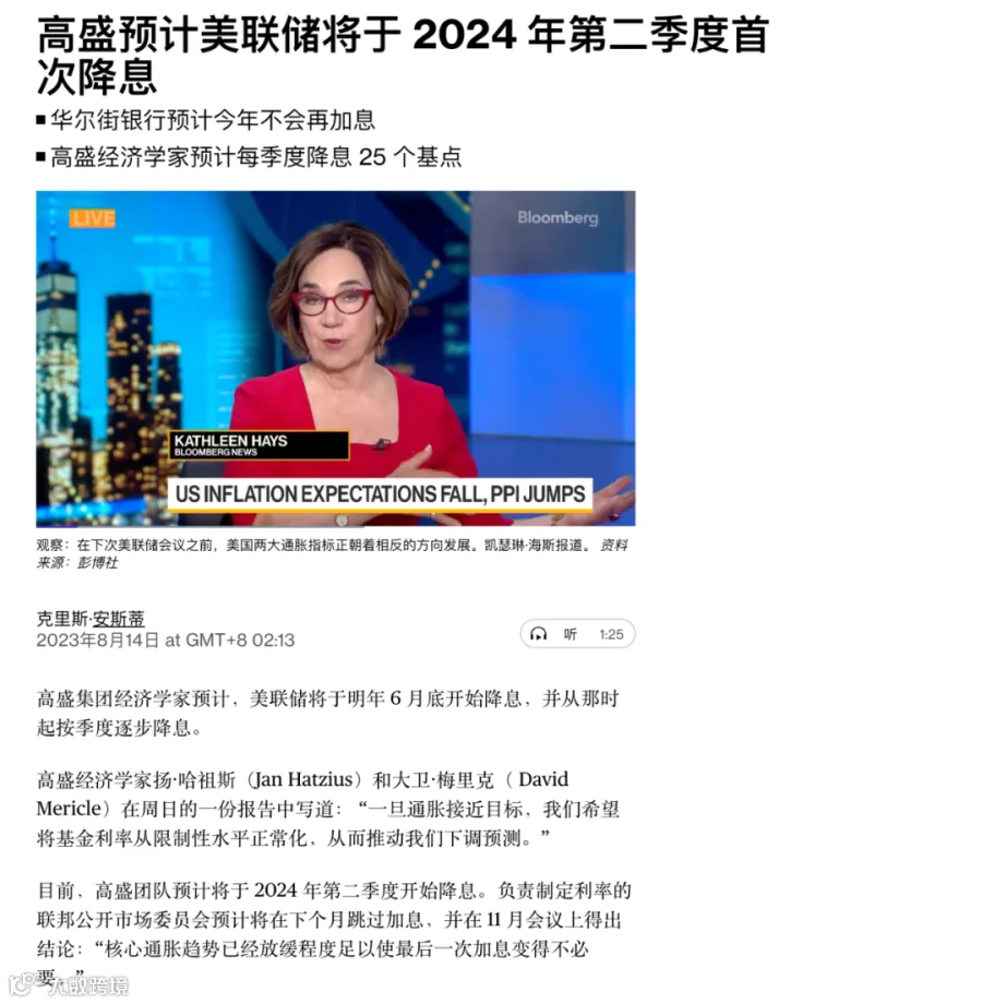 17. 高盛预计美联储将在2024年二季度开始降息,预计每季度降息25个基点