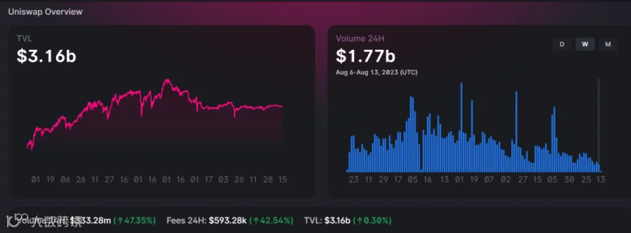 UniswapV3目前总TVL 31.6亿美金,2023年8月6日-2023年8月13日该周的总交易量为17.7亿美金,交易量较上周减少4亿美金左右,TVL基本一致,市场处于震荡区间,交易量的萎缩与市场低迷的波动行情有关。