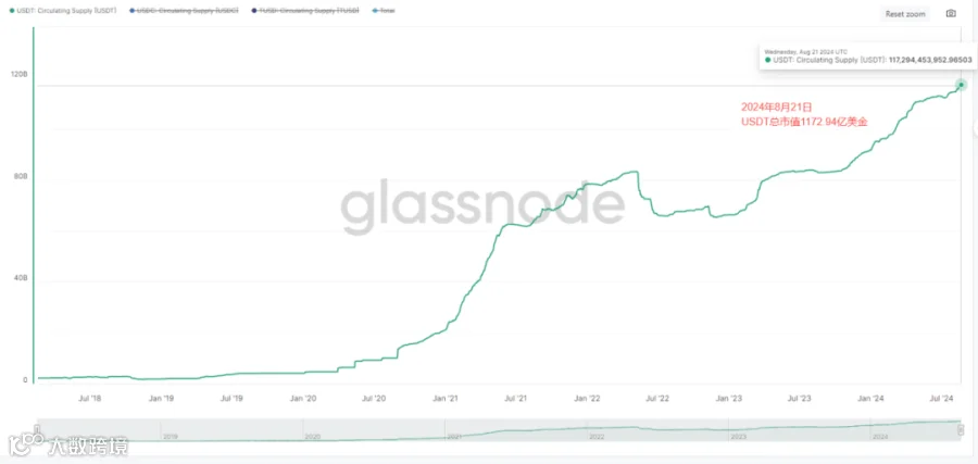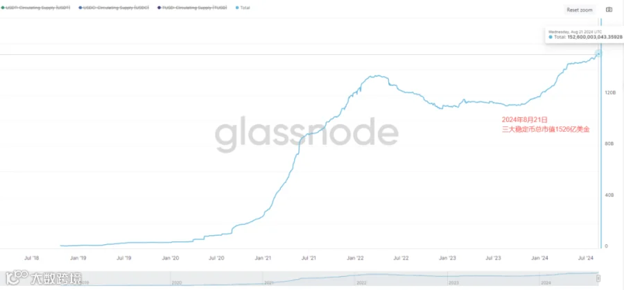 三大稳定币总市值目前为1526亿美金,相比之前的1494.4亿美元,总市值增加31.6亿美金左右。稳定币总市值本时间段内稳定增长。