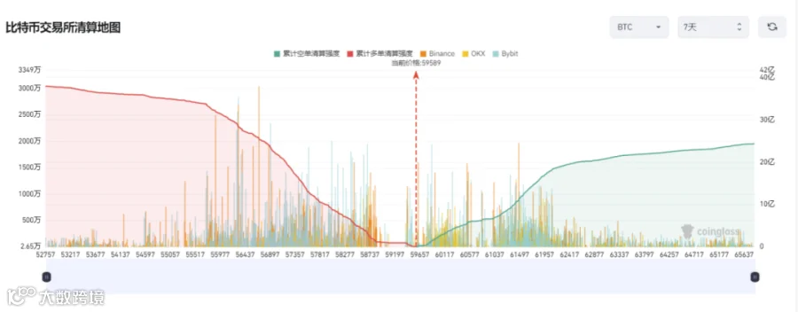i. 从本周中心化交易所合约交易BTC清算地图来看,BTC本周清算强度多头力量略胜一筹,多单累计清算强度37.77亿美元,空单方面累计清算强度24.32亿美元,空单在59657至62417为密集清算区,多单在58737至55977为密集清算区。