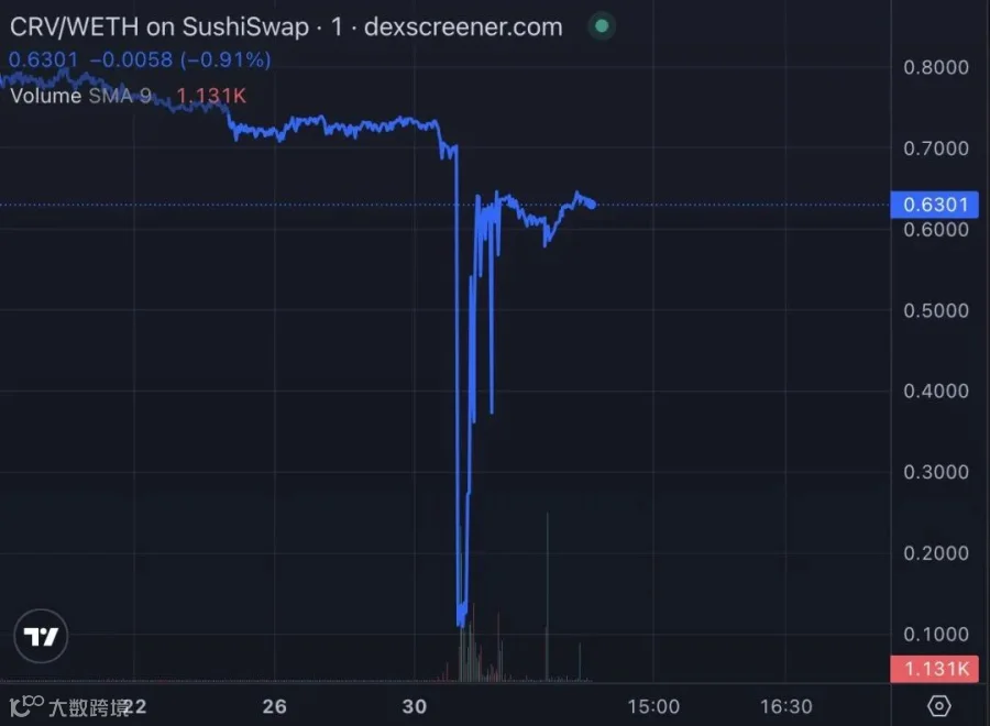 b. CRV/ETH池被黑后,链上 CRV 流动性变差,导致链上价格波动剧烈。
