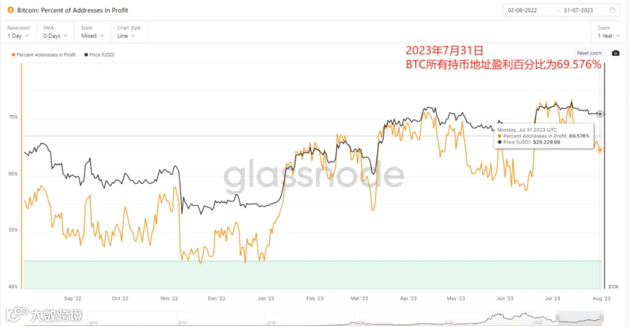 c. 从数据面来看,首先所有持有BTC的钱包地址盈利分配上有69%以上的地址目前依旧处于盈利状态,其中大部分都是长期持仓的地址。从持仓地址数量来看,持仓量大于1个BTC的地址一直在创新高,持仓量大于10的地址短期有波动情况,不过总的来看依旧还是在上涨。这可能也和最近行情比较清淡,市场流动性不足有一定关系,大部分用户还是偏向于持币等待。