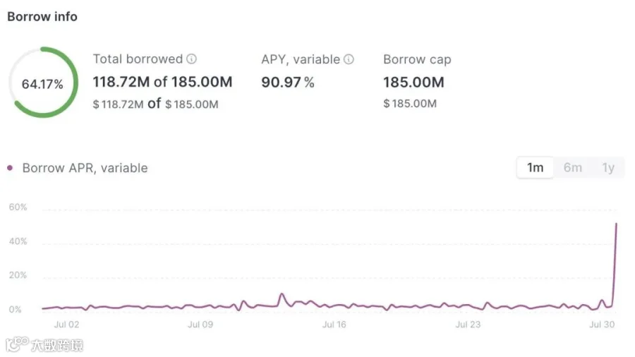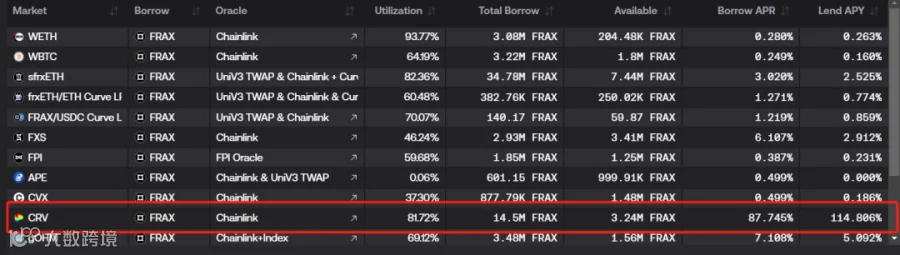 b. Aave 的 USDT 池利用率超过 50%,借款利率飙升至 91%;Fraxlend协议CRV抵押池USDT利用率甚至短时至80%以上,借贷利率超过110%。