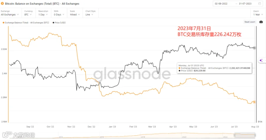 a. 本周市场行情依旧呈现震荡走势,目前BTC价格短期徘徊在29500附近。7月27日美联储如期加息25个基点,有很大可能是美联储加息周期中最后一轮,从鲍威尔后续讲话中并没有对未来政策的太多偏向性,大体上还是要根据后期数据来决定接下来的美联储政策。不管如何,随着该次加息的落地,美联储加息已接近尾声,通胀也已经距离预期不远,再叠加上BTC的减半周期,长期来看市场大概率将向着上涨的方向变动。