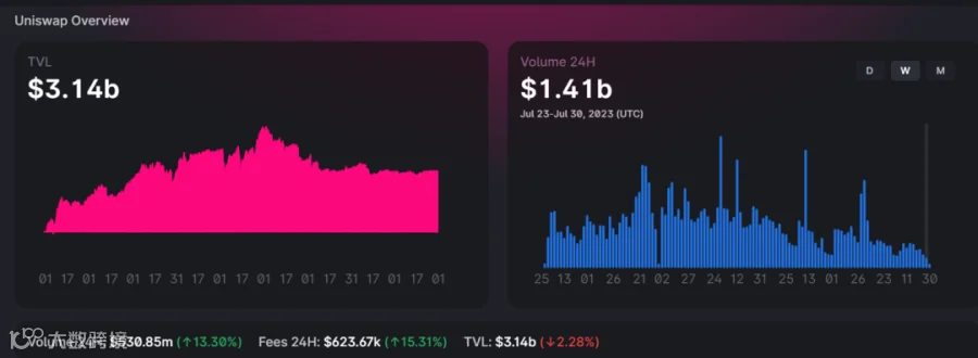 结论:UniswapV3目前总TVL 31.8亿美金,2023年7月16日-2023年7月23日该周的总交易量为22.6亿美金,交易量较上周下降9亿美金左右,TVL基本一致,市场处于震荡区间,市场情绪对交易量的影响明显,导致下降。