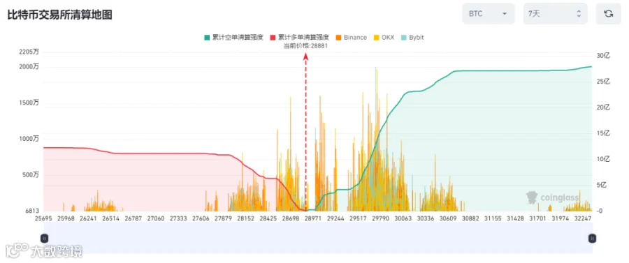 d. 从本周中心化交易所合约交易BTC清算地图来看,经历比较长周期的窄幅震荡后,中心化交易所合约清算目前上下方清算订单都比较多,下方多单清算主要集中在28500和28000位置附近,上方的清算价位相对遍布在29000到31000之间。