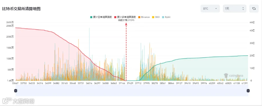 i. 从本周中心化交易所合约交易BTC清算地图来看,BTC本周多单比空单累计清算强度的差值为20亿美元,多单方面在37249至34428为密集清算区,有累计40.26亿美元的清算强度,空单方面距离当前价位存在真空区,在37751至39436为密集清算区,有累计17.94亿美元的清算强度。