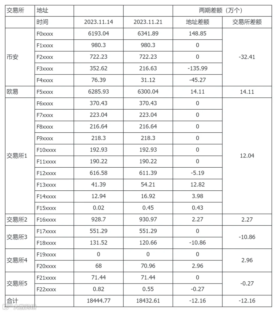 交易所地址:11 月 14 日到 11 月 21 日共流出 12.16 万个。近期从流入转换为流出,BTC价格在37000附近持续震荡,临近黑五和圣诞节假期,存在进一步下跌可能,依然建议适当减仓。