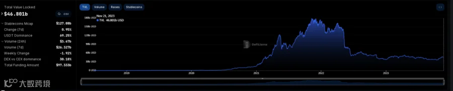 2023年11月12日- 11月19日总交易量:42.8亿美金,较上周减少近6.2亿美金。