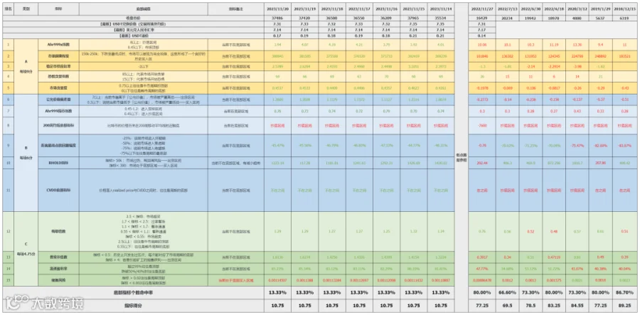 本周时间内整体市场行情回调下跌,但指标依然处于较低分值,未有入场机会。
