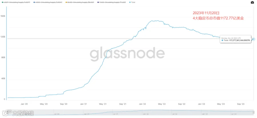 2. 四大稳定币总市值目前为1172.77亿美金,比上周的1161.79亿美元,总市值再次增加约11亿美金。
