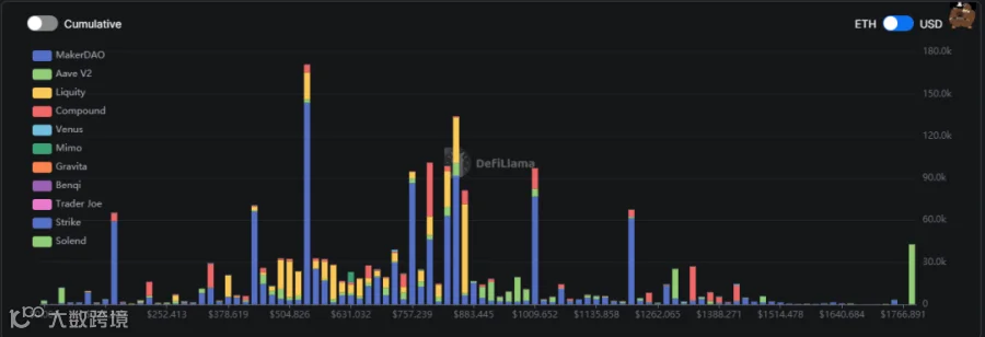 ii. 去中心化交易所方面,ETH在1784开始有清算,在1207开始有大额清算,在883至504为密集清算区,540为最大清算点。