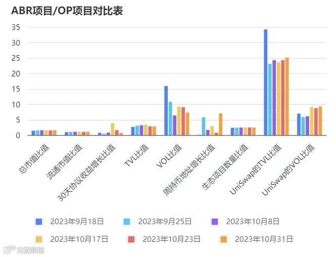 BTC价格继上周增长到35000U后,在33000U-35000U之间横盘,OP和ARB的UniSwap交易量、TVL较上一周有所增长,其中ARB的UniSwap的交易量、TVL和交易量都增长突破了1亿美元,表明市场交易活跃性开始复苏。