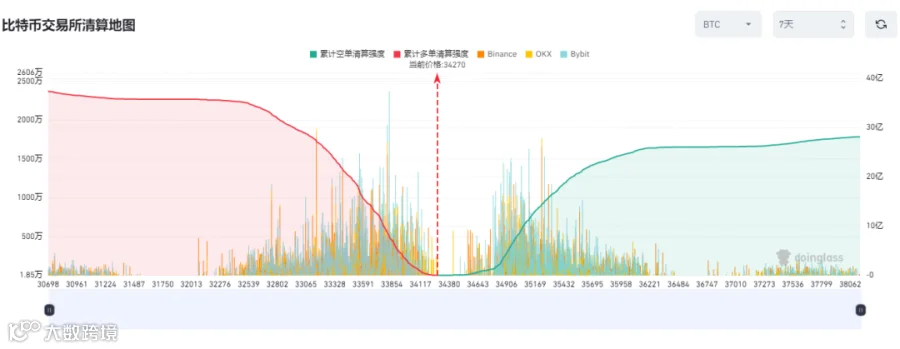 i. 从本周中心化交易所合约交易BTC清算地图来看,BTC本周多空方面差异不算大,多单方面在34270至32079有累计35.74亿美元的清算强度,空单方面在34418至36468有累计26.04亿美元的清算强度。