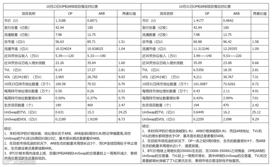 1. 本周OP价格涨突破到1.4U,ARB价格突破到0.9U,ARB地址、TVL和VOL的增长都明显优于OP,基本面长期更看好ARB。