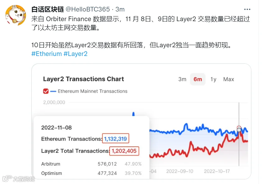 Layer2方面,近日来自 Orbiter Finance 的 L2 data 数据显示,11 月 8 日 Layer2 交易数量超过了以太坊主网交易数量。意味着Layer2开始独当一面,未来,新公链或者还未消亡的"以太坊杀手们"将面临与继承以太坊安全性的同时拥有高性能的Layer2竞争的局面。