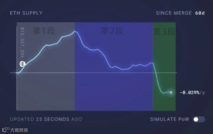 第一段是合并后的轻微通胀9月15日至10月7日期间,由于加密市场熊市,以太坊链上活动正处于低位,此时的链上活动主要是SWAP与NFT、Layer2相关的交易,GAS价格普遍在10-15之间浮动。即便链上如此少,在EIP1559与POS低通胀率的加持下,22天里,以太坊网络新增发行量12400ETH,日均增发563ETH。而合并前,日均增发在1.5万ETH左右,这何止是3倍减半。