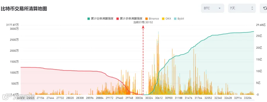 c. 从本周中心化交易所合约交易BTC清算地图来看,在30600到32000之间有比较大量的爆仓清算订单,市场很有可能在短时间内反复试探该位置引起大量的爆仓清算。而在下方的清算则相对较为分散。就目前来看市场依旧上涨概率大一些。
