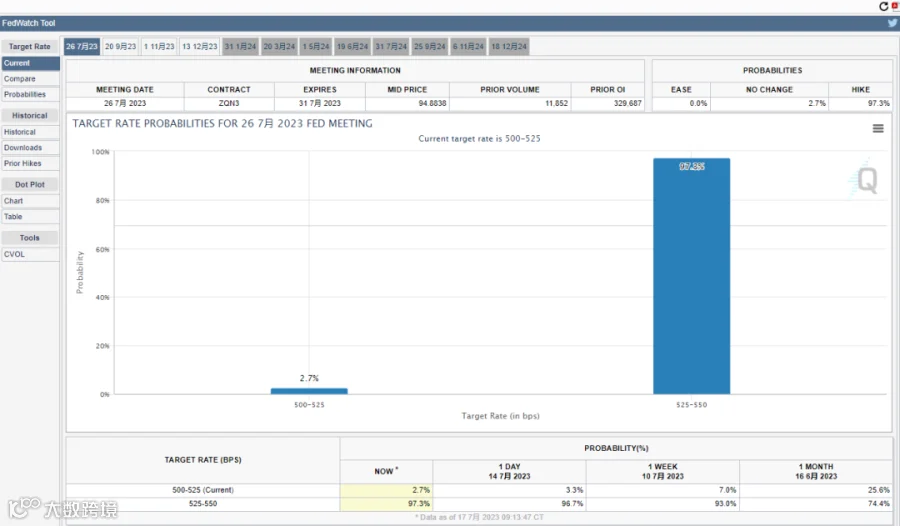 a. 本周市场关注点主要在于美国6月CPI数据,该数据预期3.1%,实际值3%,数据上有不错的利好,但是市场在数据公布时并未有明显的上涨,甚至数据公布后由于美联储官员对7月加息的预期导致市场出现明显下跌情况。之后由于SEC对瑞波币的起诉被法官裁定为,向机构销售代币为证券,二级市场直接成交代币不认定为证券。受此消息刺激市场出现不错的上涨行情。目前美联储7月加息大概率已成定局,CME市场预测加息概率为96.1%,市场更多需要关注的是在利率会议后鲍威尔的讲话内容。