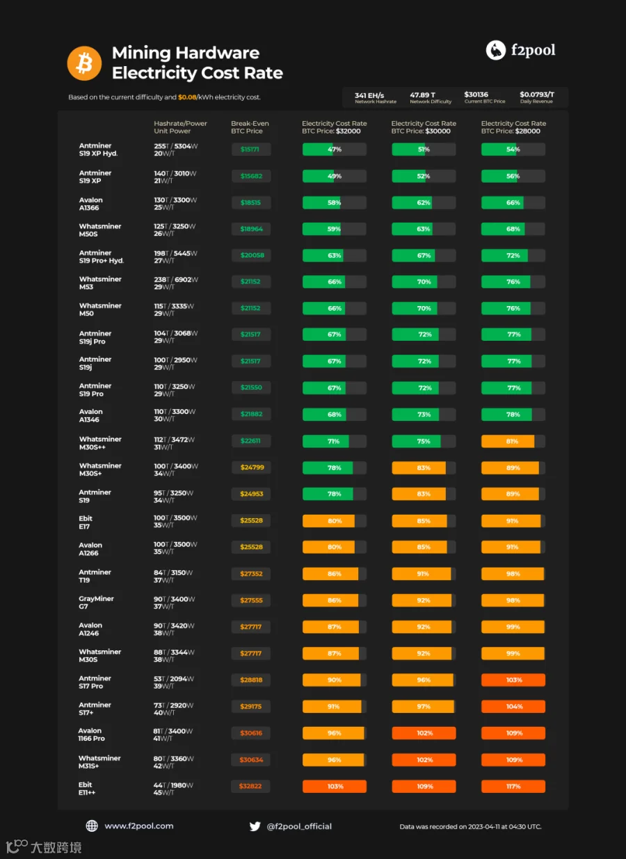 结论:随着BTC价格持续窄幅震荡,BTC最高触及31804美金,最低触及29900美金,矿机市场整体还处于底部区间,币价的企稳给予市场信心,但算力的增长增加回本周期。