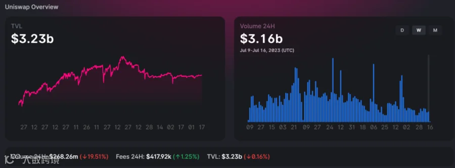 结论:UniswapV3目前总TVL 32.3亿美金,2023年7月9日-2023年7月16日该周的总交易量为31.6亿美金,交易量较上周增加2亿美金左右,TVL基本一致,市场处于震荡区间,预计V4上线后,TVL与VOL都将提升。