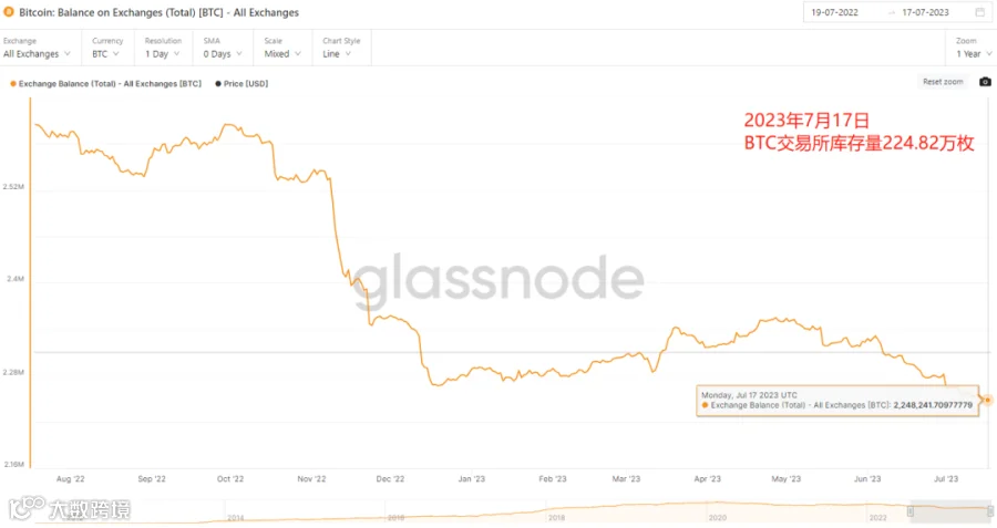 d. 从交易所库存量上来看,依旧是呈现逐步减少情况,该情况已经持续比较长时间。另外配合链上地址持币数据和持币时间的数据可以发现,近期市场的流动性确实是非常的匮乏,钱包之间和交易所之间的流动数量都比较少。