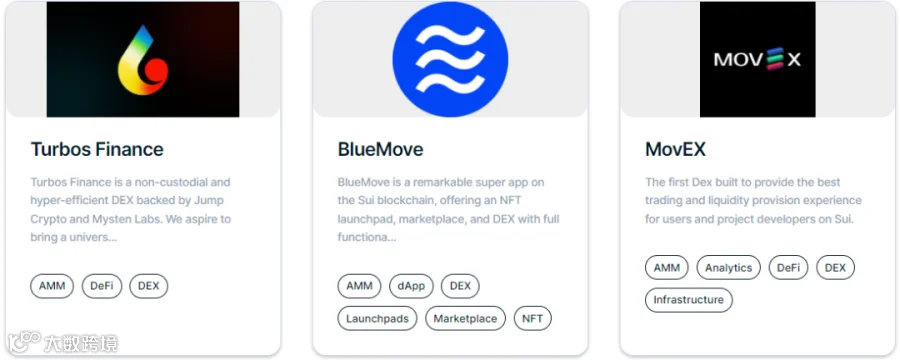 1. 截止6月13日,根据Sui生态浏览器统计,目前建设在Sui生态的项目共有66个,涵盖DeFi、GameFi、DID、钱包、CEX等方面。