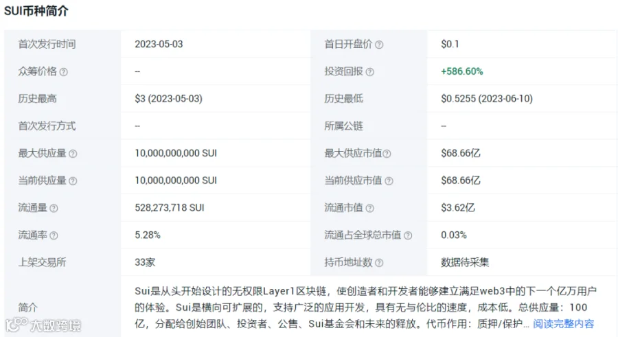 4. SUI的代币价格,基于其一级投资市场估值20亿美元,2-4倍的总市值对应币价进行买入相对合理,对应币价为0.4U-0.8U之间。
