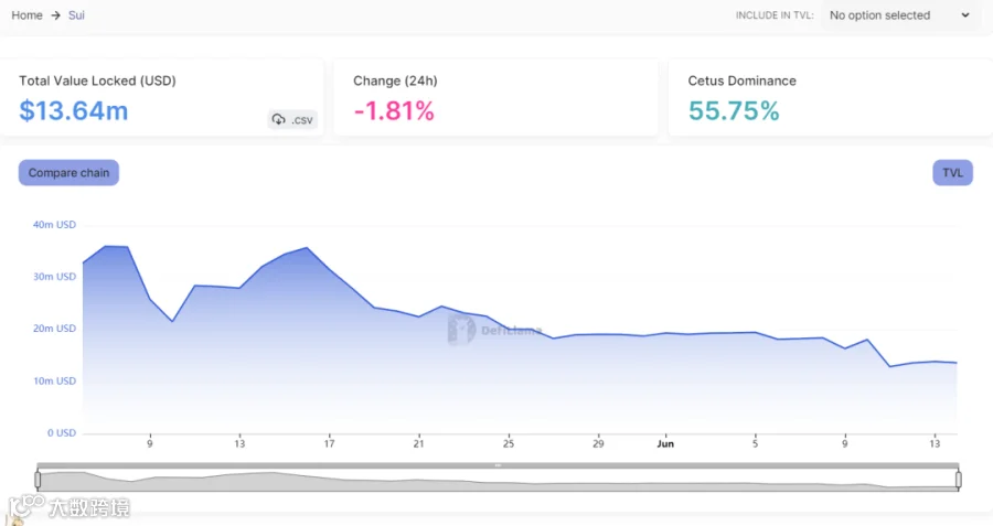 2. 根据defillama数据统计,截至6月14日Sui链上TVL为1364万美金,历史最高数据为5月7日的3600万美金,DeFi相关项目也只有10个,整体而言还处于发展的初步阶段,未来还有较大的发展空间。