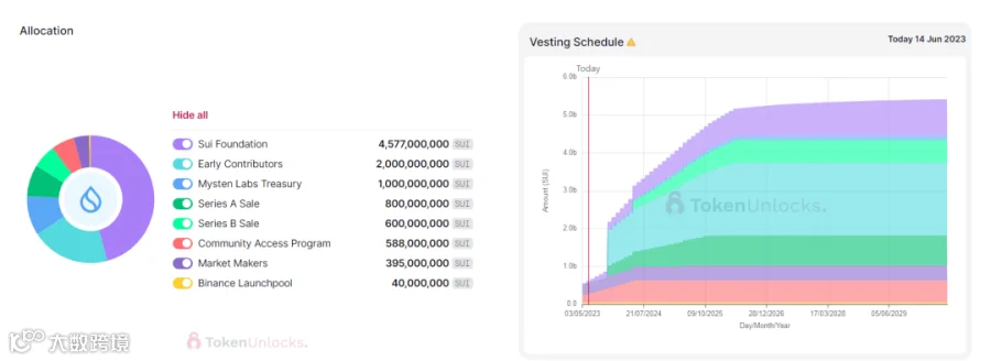 根据以上信息,SUI在2023年11月将迎来超过13.2亿枚的巨量解锁,流通量飙升至21.8亿枚,此时间前,流通量将保持缓慢上涨8.6亿枚左右。