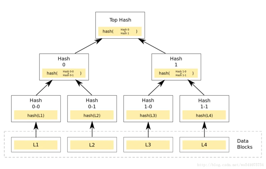 因为Merkle Tree是一种树,虽然大多数是二叉树,但也可以多叉树。不过无论是几叉树,它都具有树结构的所有特点,其叶子节点的value是数据集合的单元数据或者单元数据HASH。非叶子节点的value是根据它下面所有的叶子节点值,然后按照Hash算法计算而得出的。