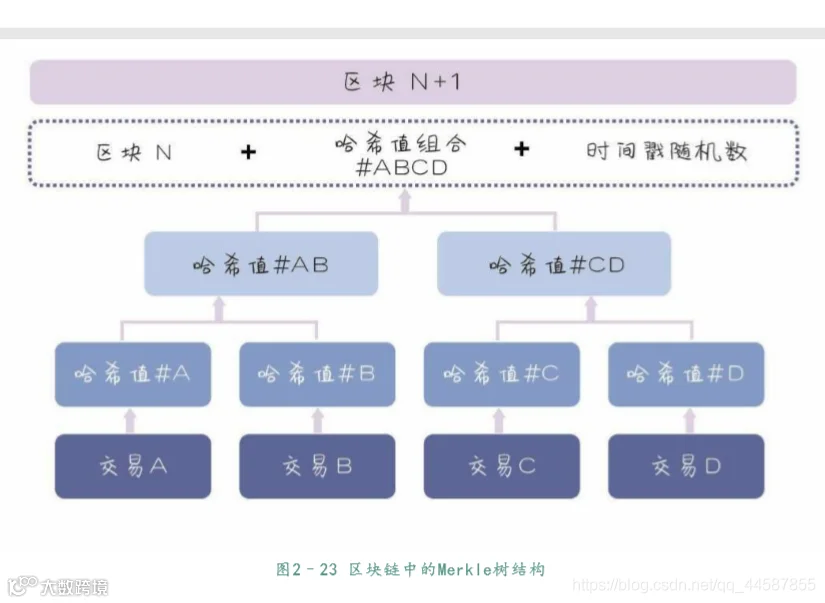 比特币区块链系统中的采用的是Merkle Tree二叉树,它的作用主要是快速归纳和校验区块数据的完整性,它会将区块链中的数据分组进行哈希运算,向上不断递归运算产生新的哈希节点,最终只剩下一个Merkle root存入区块头中。