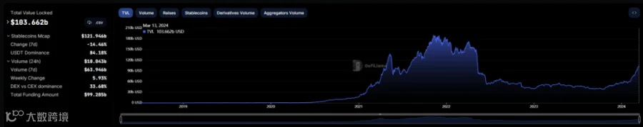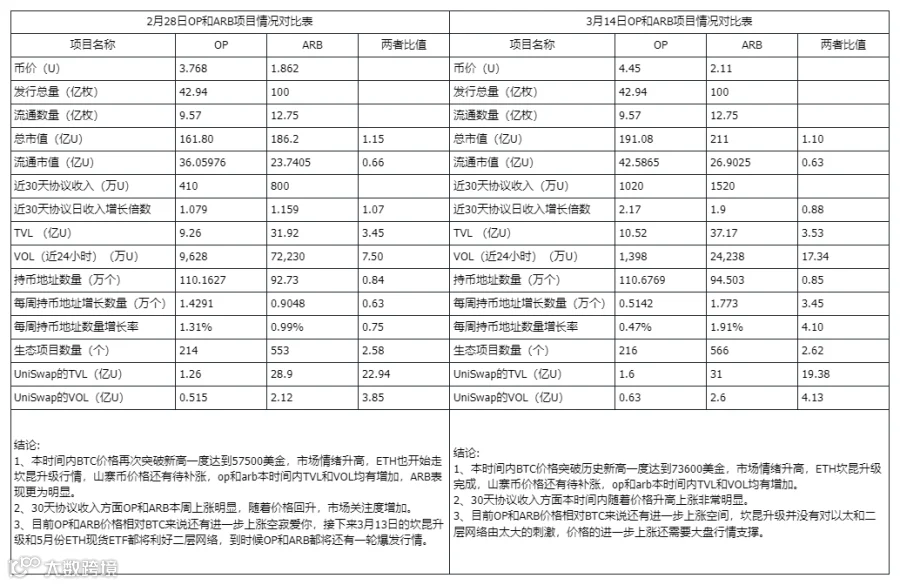 1. 本时间内BTC价格突破历史新高一度达到73600美金,市场情绪升高,ETH坎昆升级完成,山寨币价格还有待补涨,op和arb本时间内TVL和VOL均有增加。