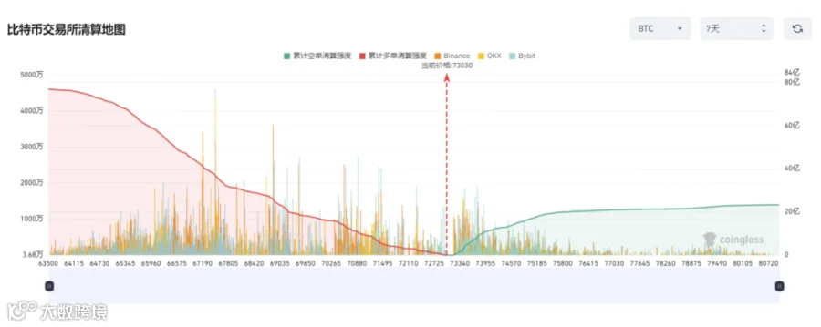 i. 从本周中心化交易所合约交易BTC清算地图来看,因比特币价格上涨,BTC本周多单累计清算强度远超于空单累计清算强度,空单累计清算强度21.14亿美元,多单方面累计清算强度76.62亿美元,多单在72725至64115为密集清算区,空单在73340至75800为密集清算区。