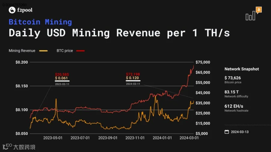 本时间内BTC价格持续走高并突破历史高点,最高触及73777美金,目前BTC价格表现强势,矿机挖矿单T日收益已达到0.12美元,相比一年前增加一倍。