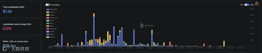 ii. 去中心化交易所方面,ETH2063开始有大额清算,在1185至355为密集清算区,521为最大清算点。